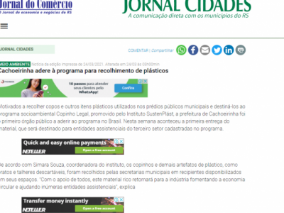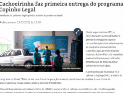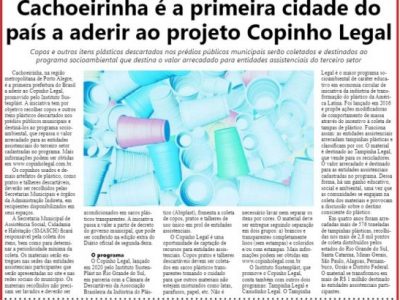 Cachoeirinha, na região metropolitana de Porto Alegre, é a primeira prefeitura do Brasil a aderir ao Copinho Legal, promovido pelo Instituto Sustenplást. A iniciativa tem por objetivo recolher copos e outros itens plásticos descartados nos prédios públicos municipais e destiná-los ao programa socioambiental, que repassa o valor arrecadado para as entidades assistenciais...